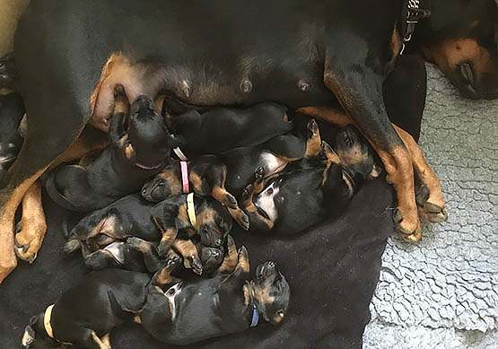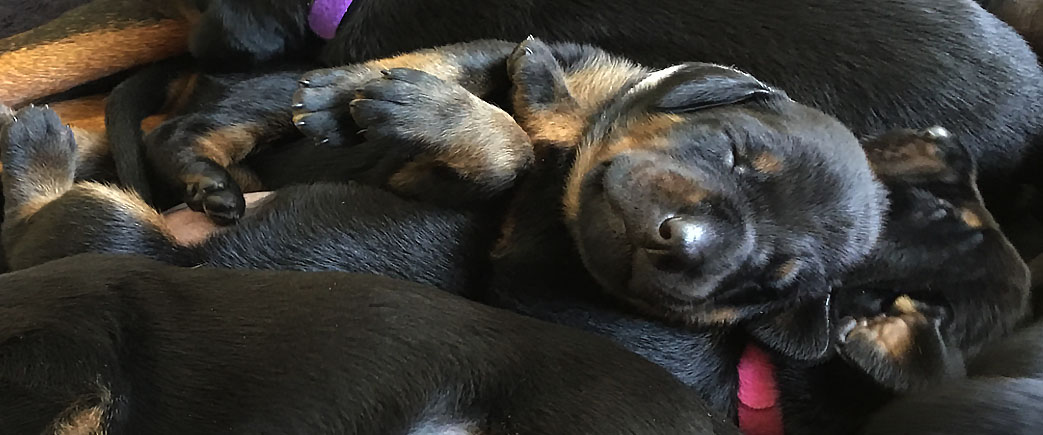 Biba has just had a littler of pups, four boys and five girls, all black and tan.